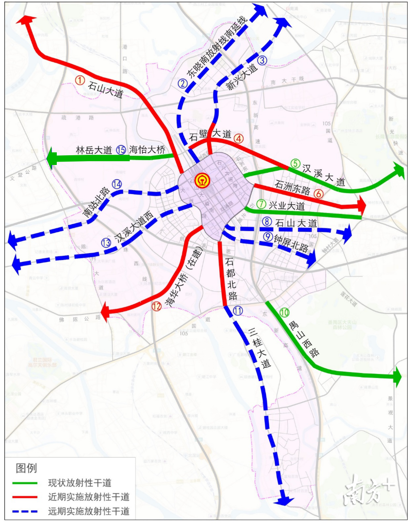 同時(shí)延續(xù)原控規(guī)規(guī)劃的放射路網(wǎng)骨架,加快10條放射性主干道建設(shè),打造南站本體15分鐘快速集散系統(tǒng)。同時(shí)南站地區(qū)建設(shè)16座公交站場,包括4座樞紐站和12座首末站;社會(huì)停車場11處,約6100個(gè)泊位。