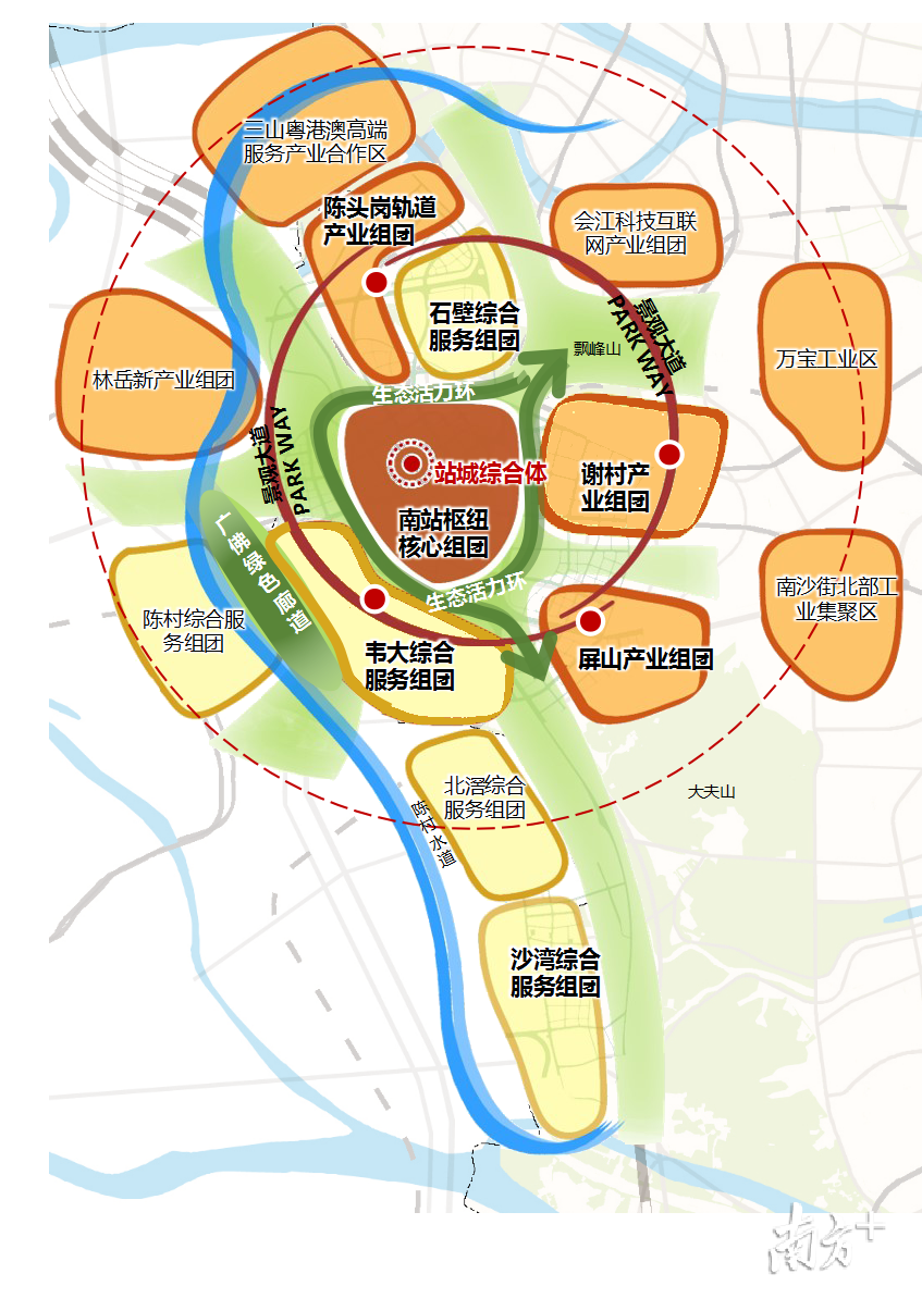 面向粵港澳大灣區(qū)全面合作的門戶樞紐,引導(dǎo)南站及周邊地區(qū)從交通集散樞紐,向粵港澳大灣區(qū)高端要素全球配置的門戶樞紐轉(zhuǎn)型。